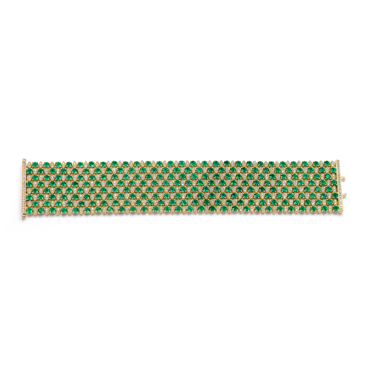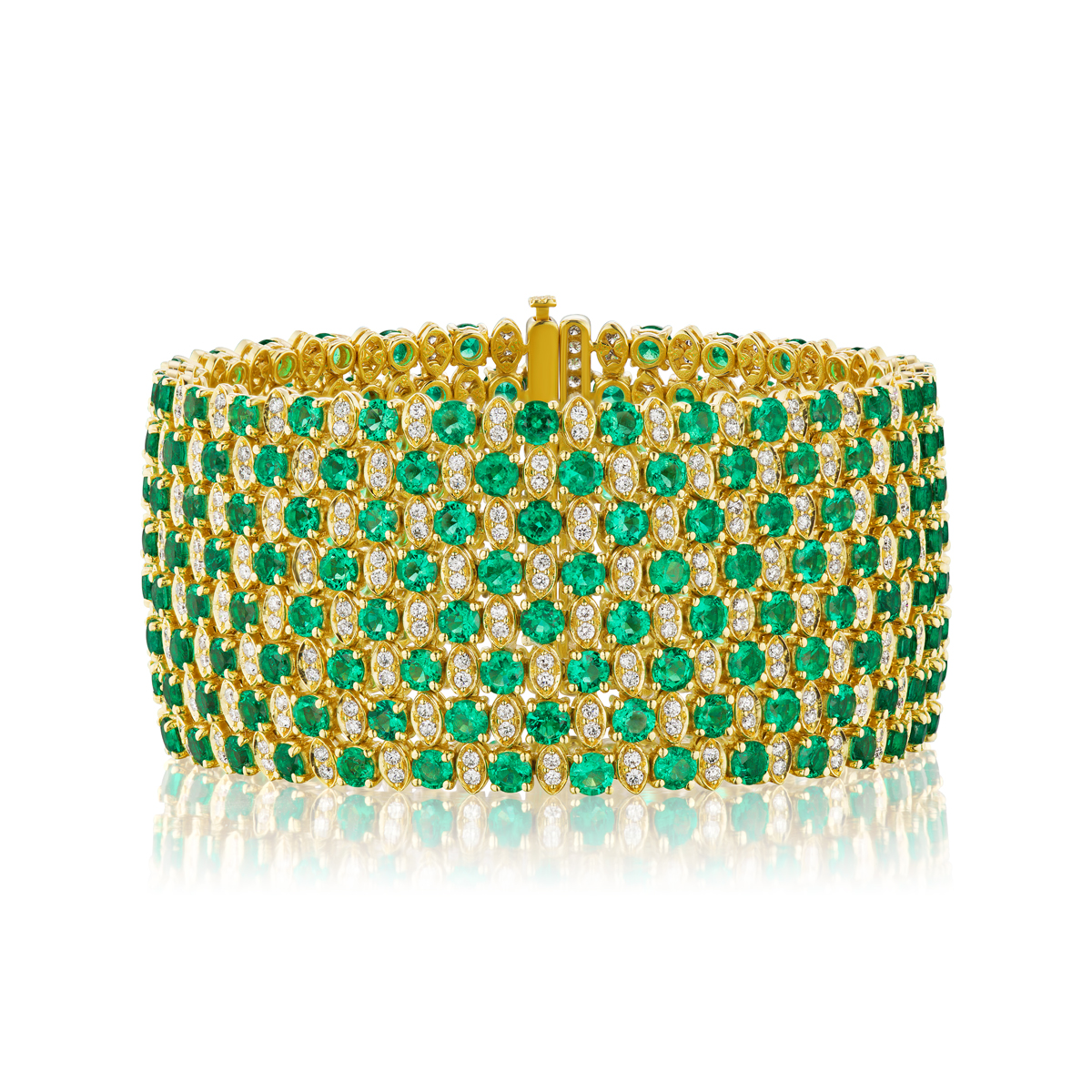 An elegant diamond and Emerald trellis winds its way around the wrist. Its a handmade piece made with perfectly matched Colombian Emerald rounds and diamonds.