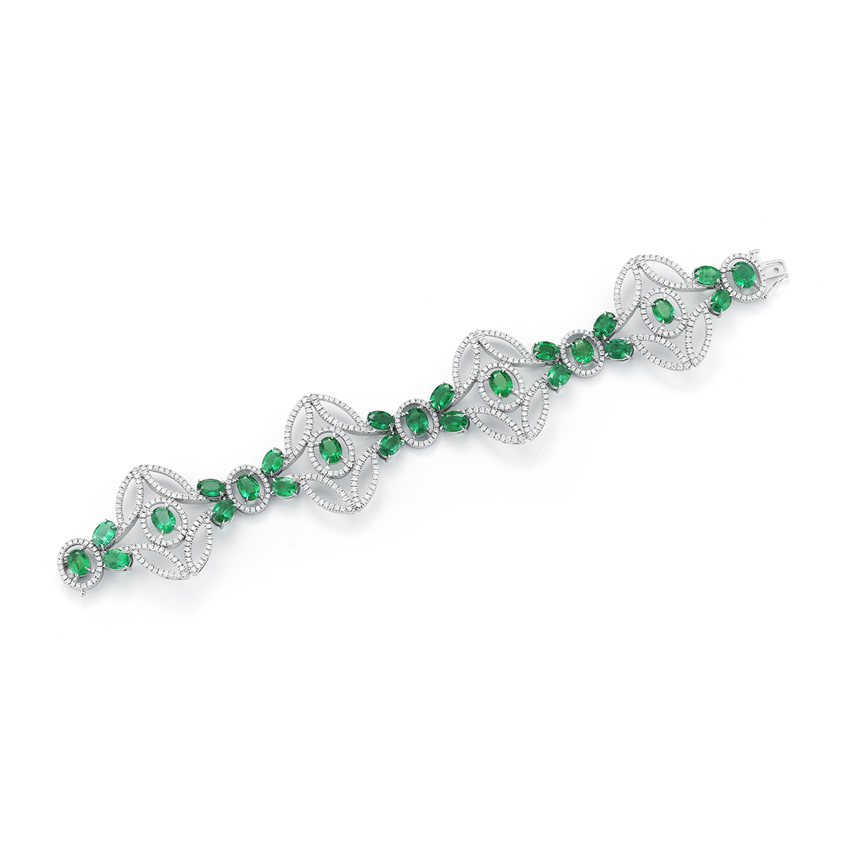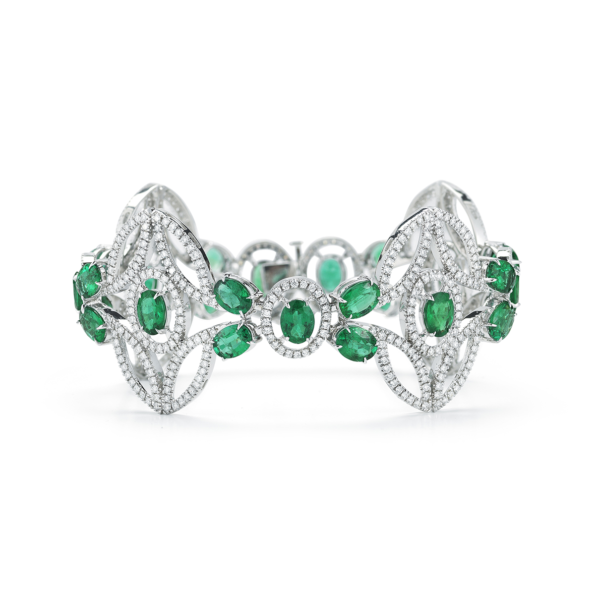 A beautiful airy design with great visual impact features a collection of perfectly matched Zambian emeralds.