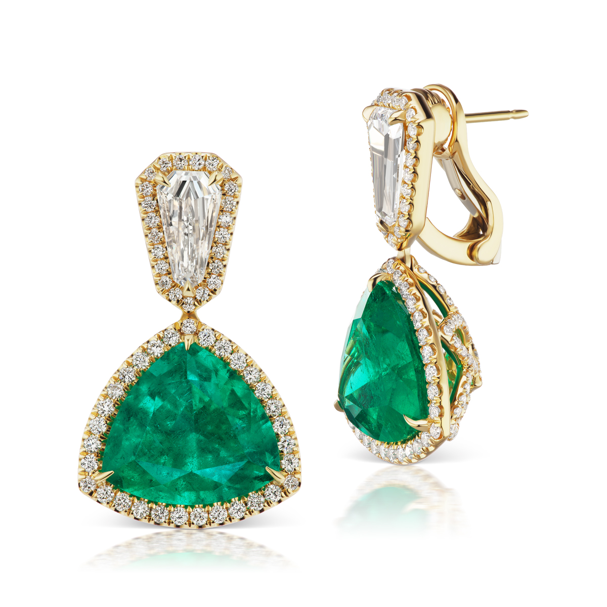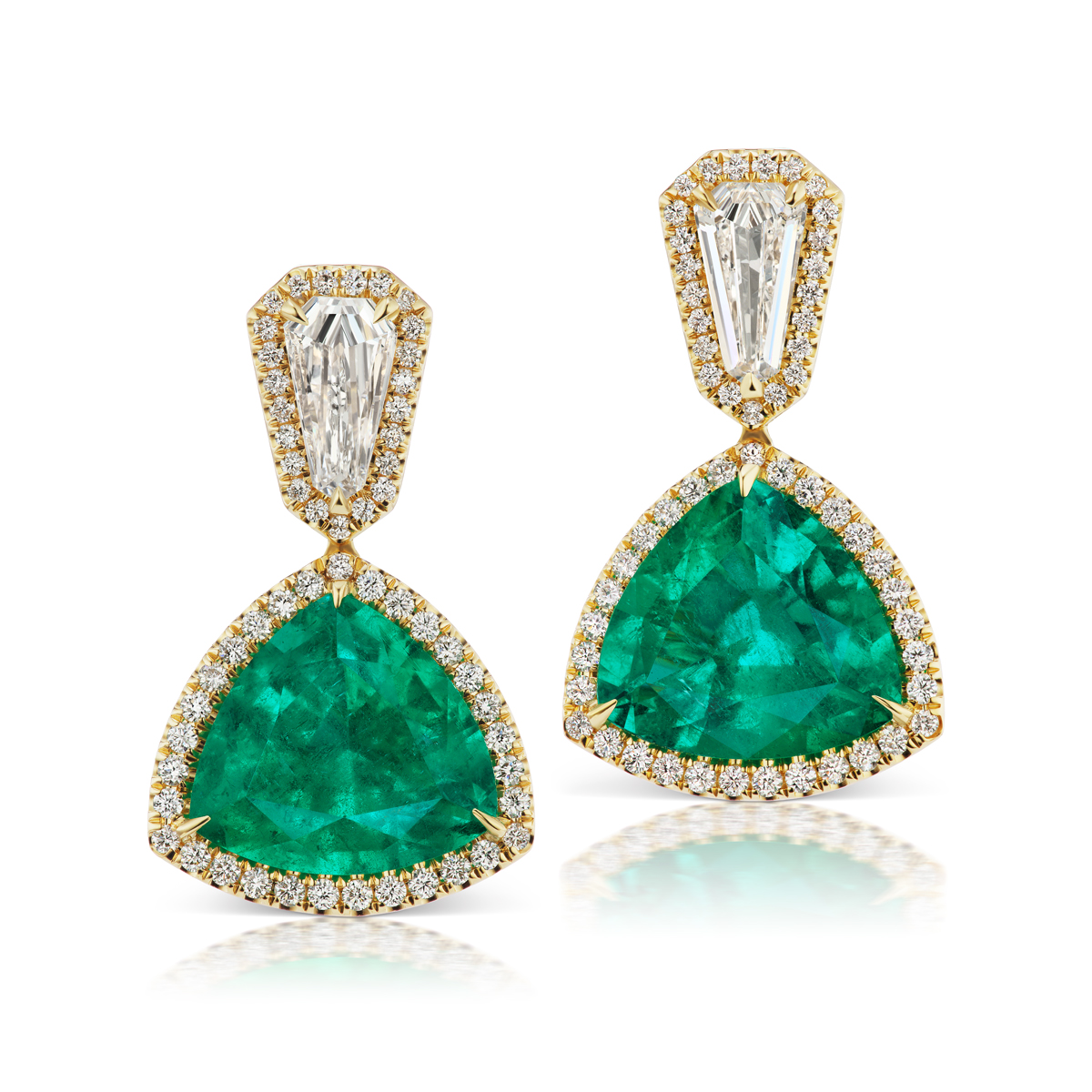 A vibrant color combination from these luscious trillion cut Colombian emeralds and VS grade bright diamonds really have luxury spelled all over these earrings.