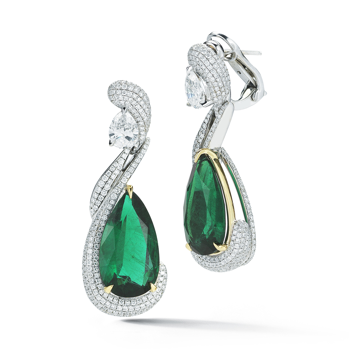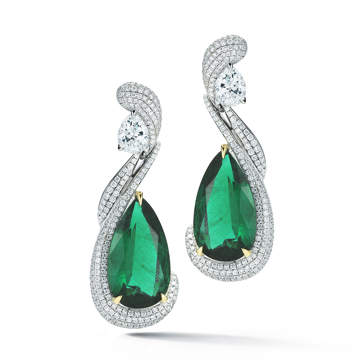 A picture of elegance defined, these matched Emerald pears are encircled by winding diamond pave.