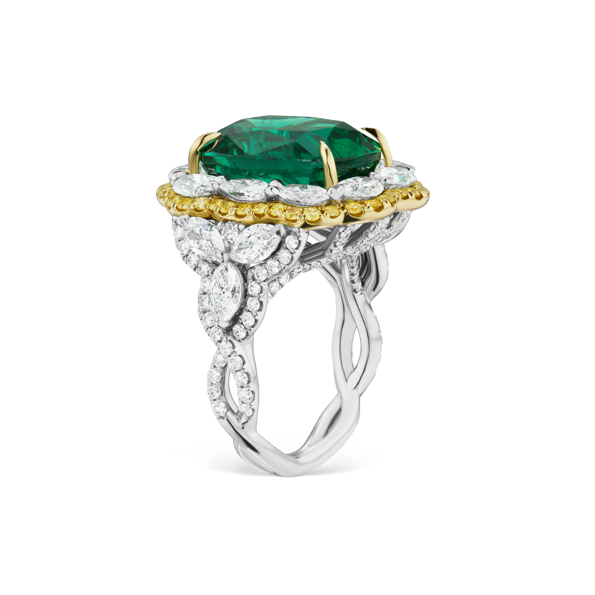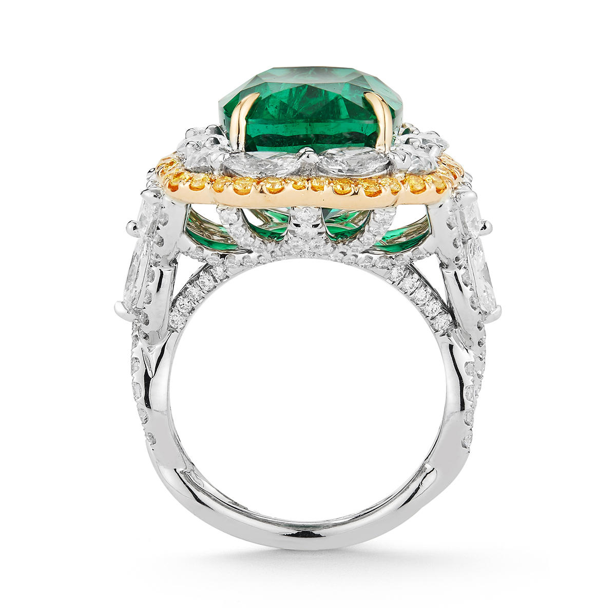 A triumph of design, this extraordinary floral design features a high quality 13 ct Cushion cut Emerald, surrounded by a dynamic double halo of oval and round shaped white and fancy yellow diamonds.