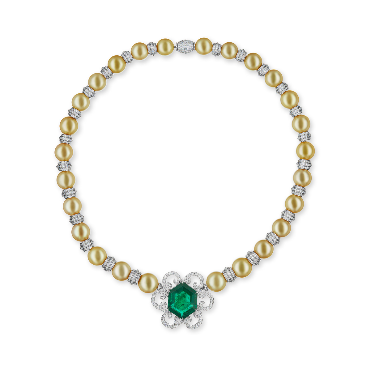 Luminous Golden South Sea pearls and diamond beads create a soft and elegant necklace. The main attraction in this piece is a green hued Hexagonal shaped Emerald enclosed by glimmering diamonds creating a gorgeous flower print.