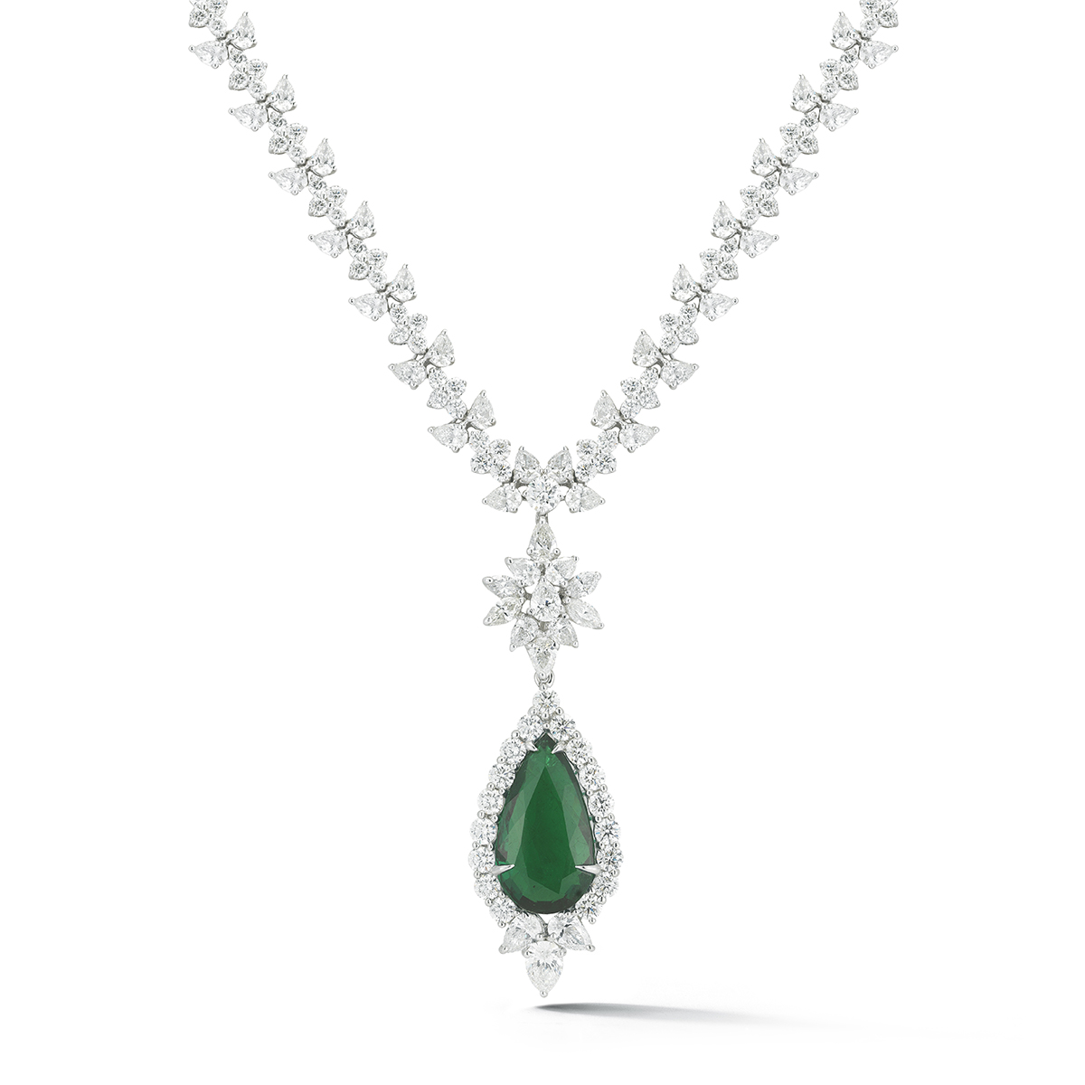 A beautifully refined 13 ct Emerald dangles from a snowflake inspired pattern of polished white diamonds.