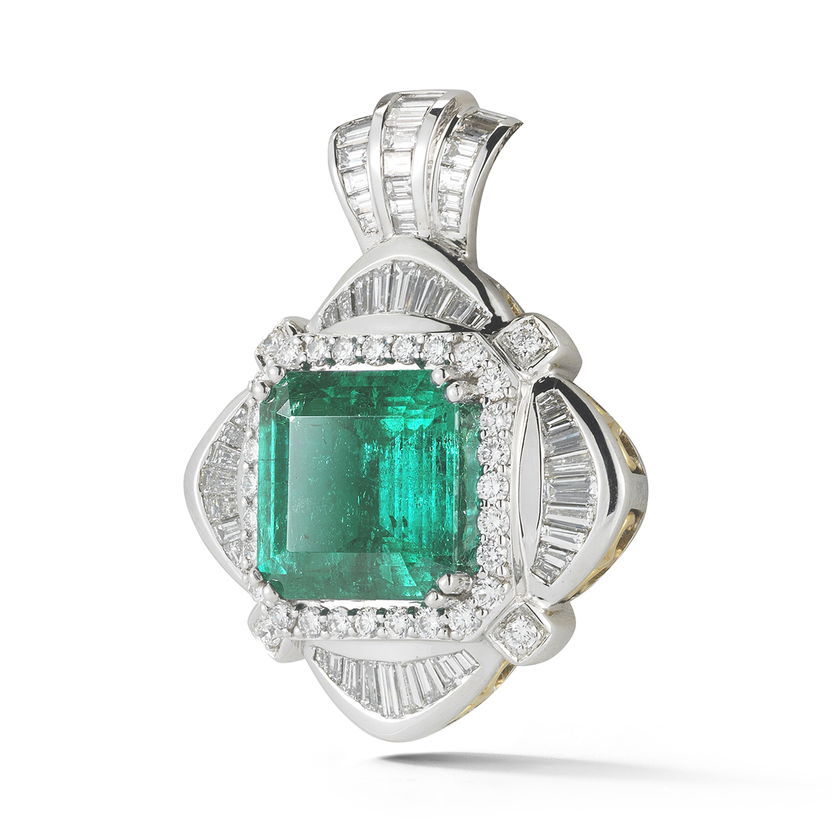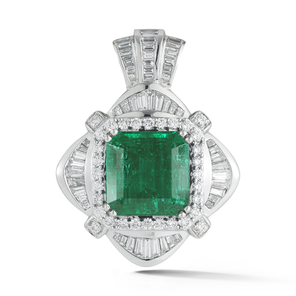 An exquisitely colored Colombian emerald takes center stage in this remarkable pendant.