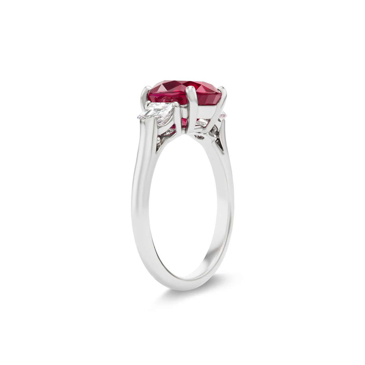 Two radiant bullet shape diamonds set in the finest platinum give life to this elegant 3 ct Oval shaped Pigeon blood colored Ruby.
