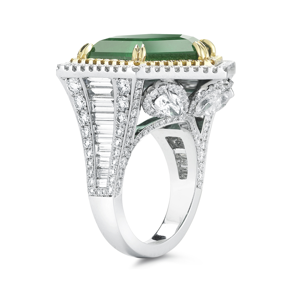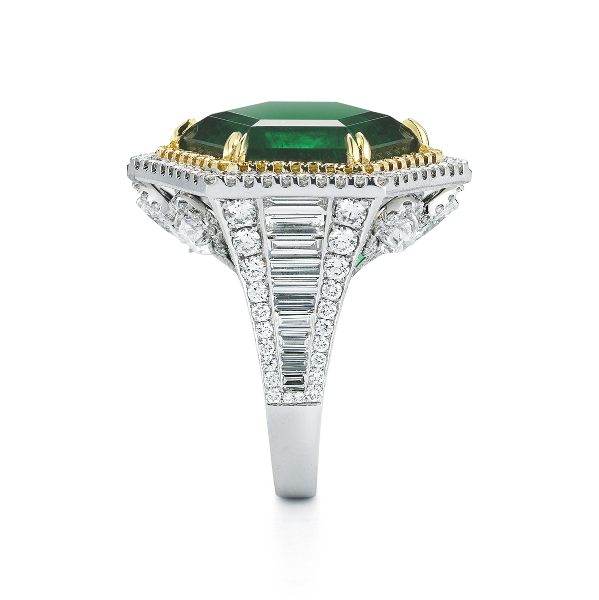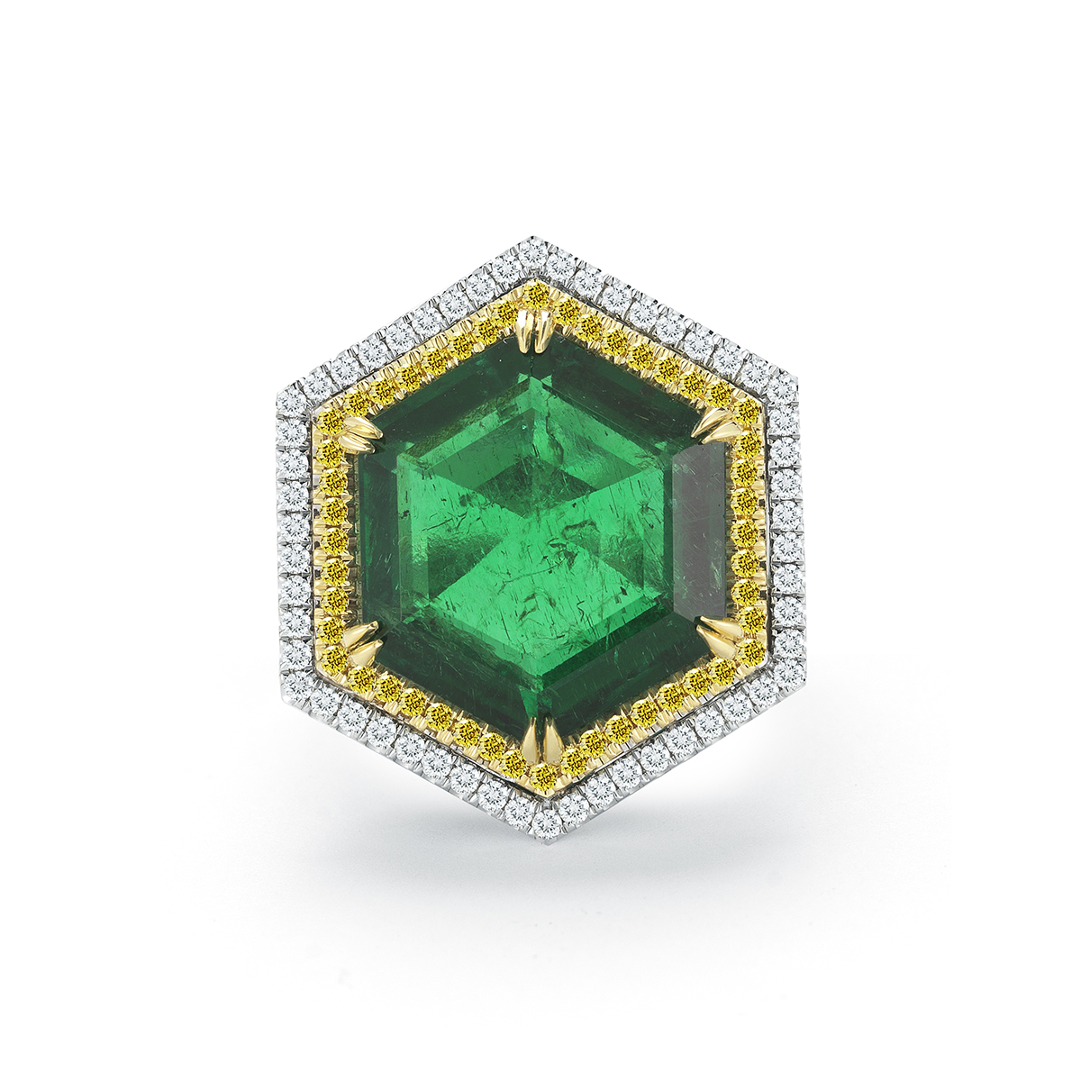 A truly out of the ordinary and very rare hexagonal shaped Emerald is surrounded by a halo of Fancy Yellow and white diamonds creating a unique and striking presence for who ever wears this ring.