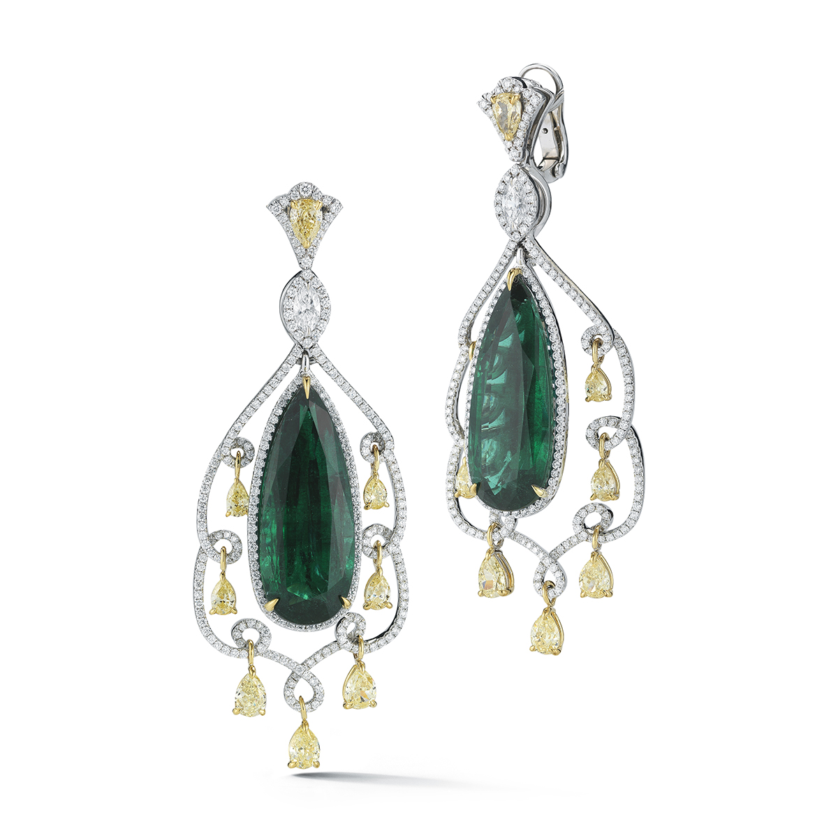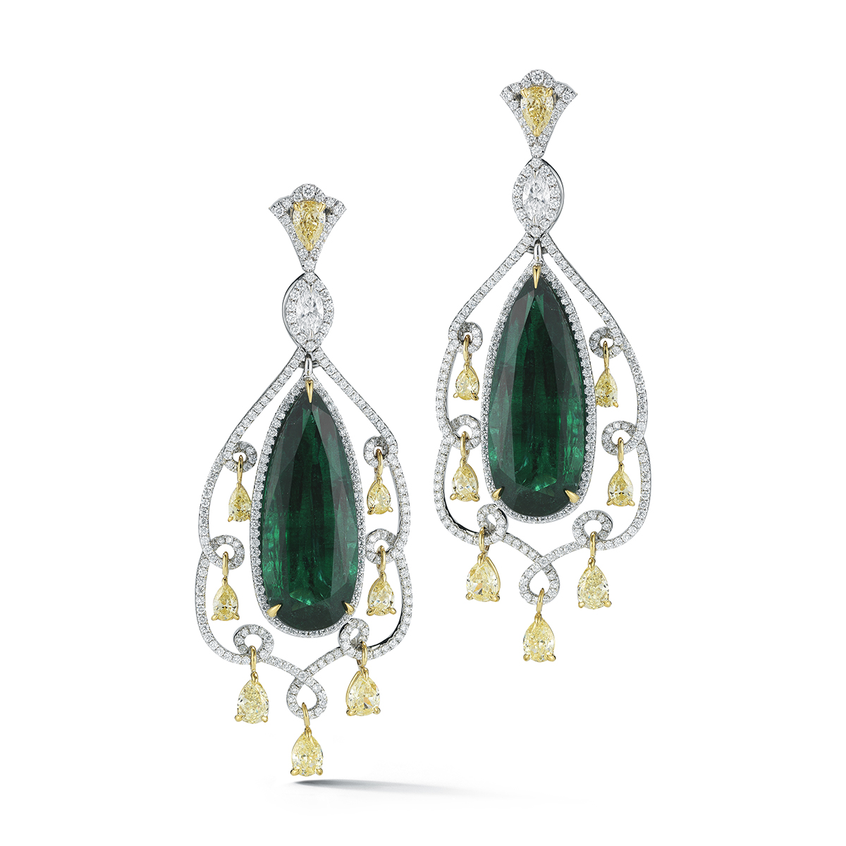 The deep green of these 38 ct GIA certified Emeralds is intensified by an elegant yet fancy pattern of white and yellow diamonds.