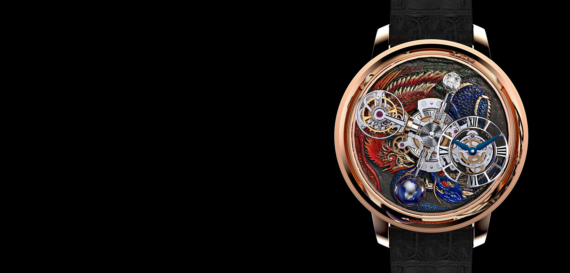 The tourbillon is widely considered the ultimate complication, as it turns and spins to counter the effects of gravity on the precision of the movement. For the Astronomia Collection, Jacob & Co. has taken the tourbillon one step farther, introducing additional axes in which the tourbillon turns. For the Astronomia Art Dragon and Phoenix, the tourbillon is triple-axis – turning in two axes: one in 60 seconds and the second in 2.5 minutes and the third going around the dial in 10 minutes.