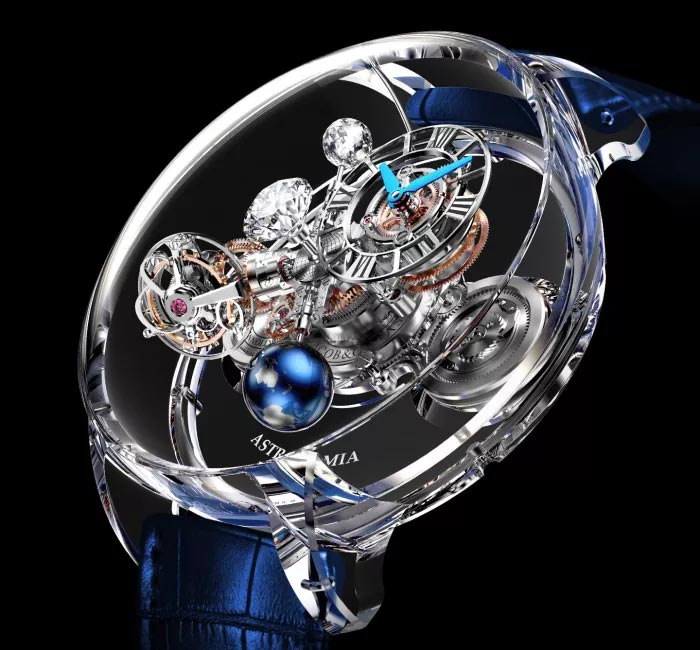 The groundbreaking Astronomia four-arm vertical movement has proven to be a creative and technical watchmaking achievement. Each arm has a unique complication exclusive to Jacob & Co.: A magnesium and hand-lacquered globe of the earth, a spherical-shaped diamond with 288 facets known as the “Jacob-Cut,” a patented triple-axis tourbillon, and a subdial for the hours and minutes with a patented timepiece-differential gear system.