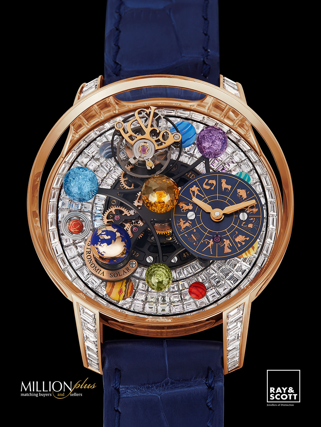 Despite its close-packed design, the Astronomia Solar Planets Jewelry displays the precious planets of our Solar System as Jacob-Cut®, 288-facet gemstone spheres, placed on the rotating platform of the Astronomia Solar caliber. Its three main arms carry the differential-driven, self-leveling time display, the magnesium globe in hand-painted blue for a spectacular representation of Planet Earth, the one-minute flying tourbillon regulating organ. Its subsidiary arms carry three Jacob-Cut®, 288-facet stones, along with a center-mounted, 1.5ct Citrine stone to represent our Sun. The Astronomia Solar Planets Jewelry makes for a beautifully artistic, highly refined and fully mechanical recreation of our solar system, to be appreciated like it has never been done before.