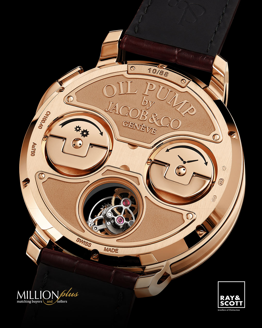 DIAL & HANDS: Dial: Grill shaped base dial; Hour/Minute Dial with central sapphire crystal; Arabic numerals index; 18K Rose Gold plated Derricks; Green Barrel and 18K Rose Gold Pipelines; Power Reserve Indication at 3 o’clock; Hands: 18K Rose Gold Jacob&Co designed hands.