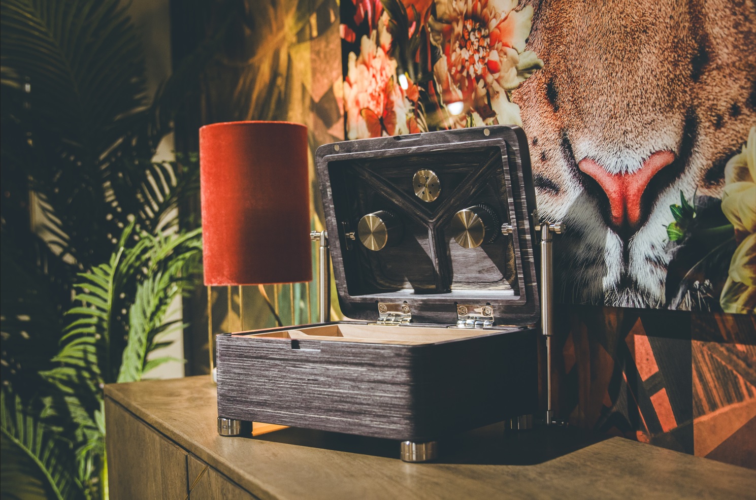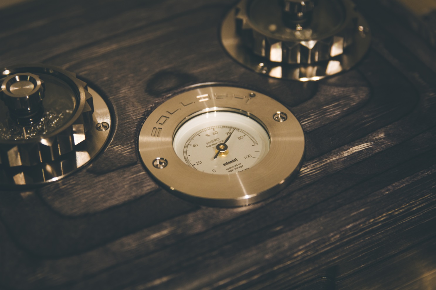 Every Solloshi wooden humidor features a crucial element: a titanium capsule on the top of the box and a stainless steel capsule inside. These capsules enable a flexible humidification and flavoring system, providing users with nearly limitless options for storing and enhancing the flavor of their cigars.Our top-of-the-line humidor is designed with the utmost sophistication, featuring two exterior stainless-steel gas springs that facilitate a graceful and effortless opening motion. The top also includes two exterior humidifiers made of titanium with tempered glass lids that allow you to add humifluid or any spirits to the system without disrupting the harmonious environment. The Adorini hygrometer adds an air of exclusivity, giving you the power to maintain the perfect humidity level inside the humidor.