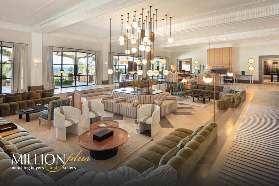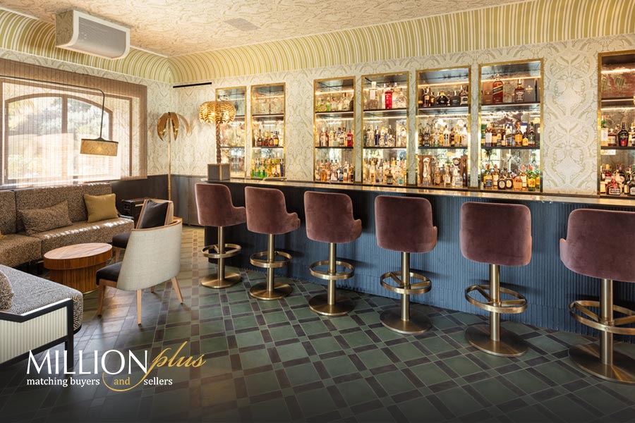 This truly impressive villa opens up to a stunning grand salon with multiple lounge spaces built within a sunken area, each section staying true to its eccentric style, with an impressionable brass centre chandelier. You can also find a separate dining area with opposing dual open steal fireplaces with wooden clades. A surprise element hides just behind the velveted curtains, where you can find a fully customised cocktail bar with incorporated Bose speakers, personalised lighting elements, multiple chill-out areas, art-deco flooring and even a smoke machine.