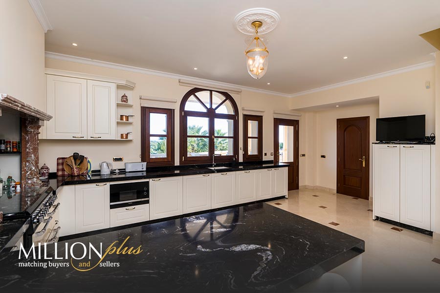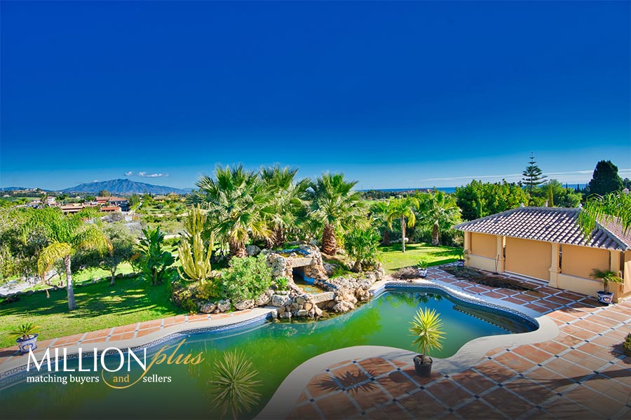 As you enter through the majestic wooden gate, you’ll be greeted by a grand entrance hall featuring a double height reception room and an Andalucian courtyard. The villa’s classic Mediterranean style is complemented by a tasteful use of marble and authentic Andalucian features. The villa’s interior is equally impressive, with a spacious dining room, a fully equipped kitchen, a TV-room/bedroom, and stately salons overlooking the lush garden and countryside, with stunning views towards the Mediterranean Sea.