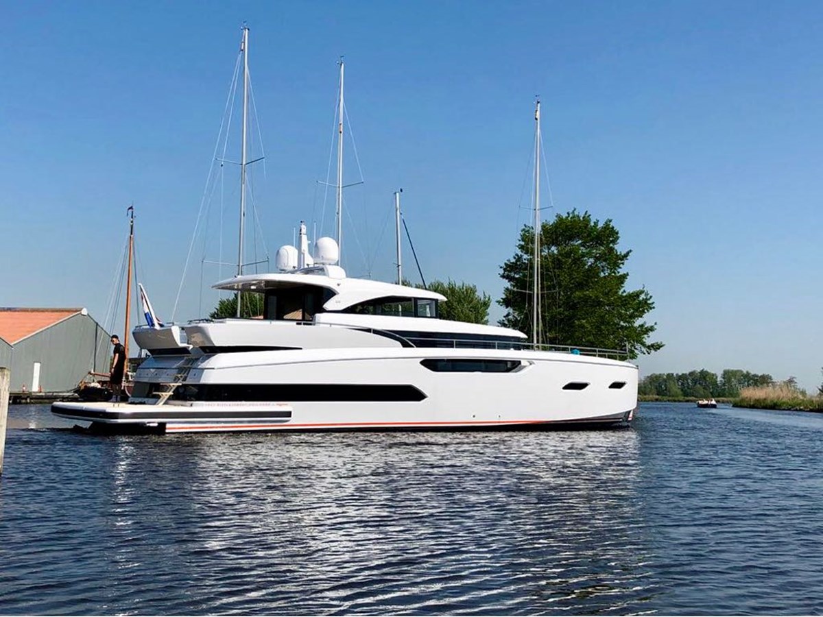 Headroom (m) 2,05 Year built 2018 Launched 2020 and never cruised since Hull colour white Hull shape with hull vane Fast Displacement Hull Keel type box keel Superstructure material aluminium Rubbing strake stainless steel Deck material aluminium Deck finish teak imitation Superstructure deck finish paint Cockpit deck finish teak imitation Antifouling (year) 2018 Window material Fluss Glued windows tempered glass Portholes Insulation airfoil Radar arch