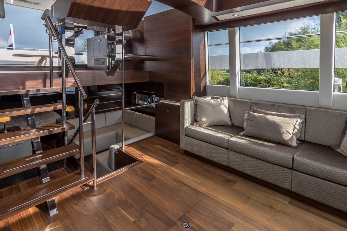 Cabins 3 – Berths 6 Interior Modern walnut Layout Custom Floor Parquet Aft Deck Pilot House Saloon With L-shaped sofa Sliding roof king size, electric Largest Webasto custom ever built. Kabola central heating Air-conditioning in each cabin reverse cycle airco Navigation center Aft Cabin Dining room with a large U-shaped sofa Opening door to aft deck fully opening folding.