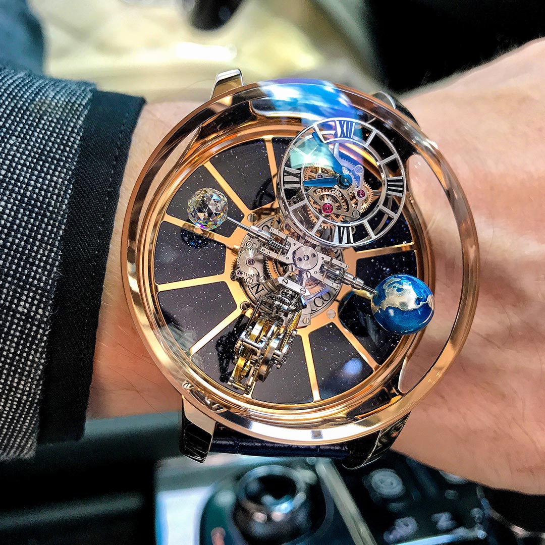 The groundbreaking Astronomia four-arm vertical movement has proven to be a creative and technical watchmaking achievement. Each arm has a unique complication exclusive to Jacob & Co.: A magnesium and hand-lacquered globe of the earth, a spherical-shaped diamond with 288 facets known as the “Jacob-Cut,” a patented triple-axis tourbillon, and a subdial for the hours and minutes with a patented timepiece-differential gear system.