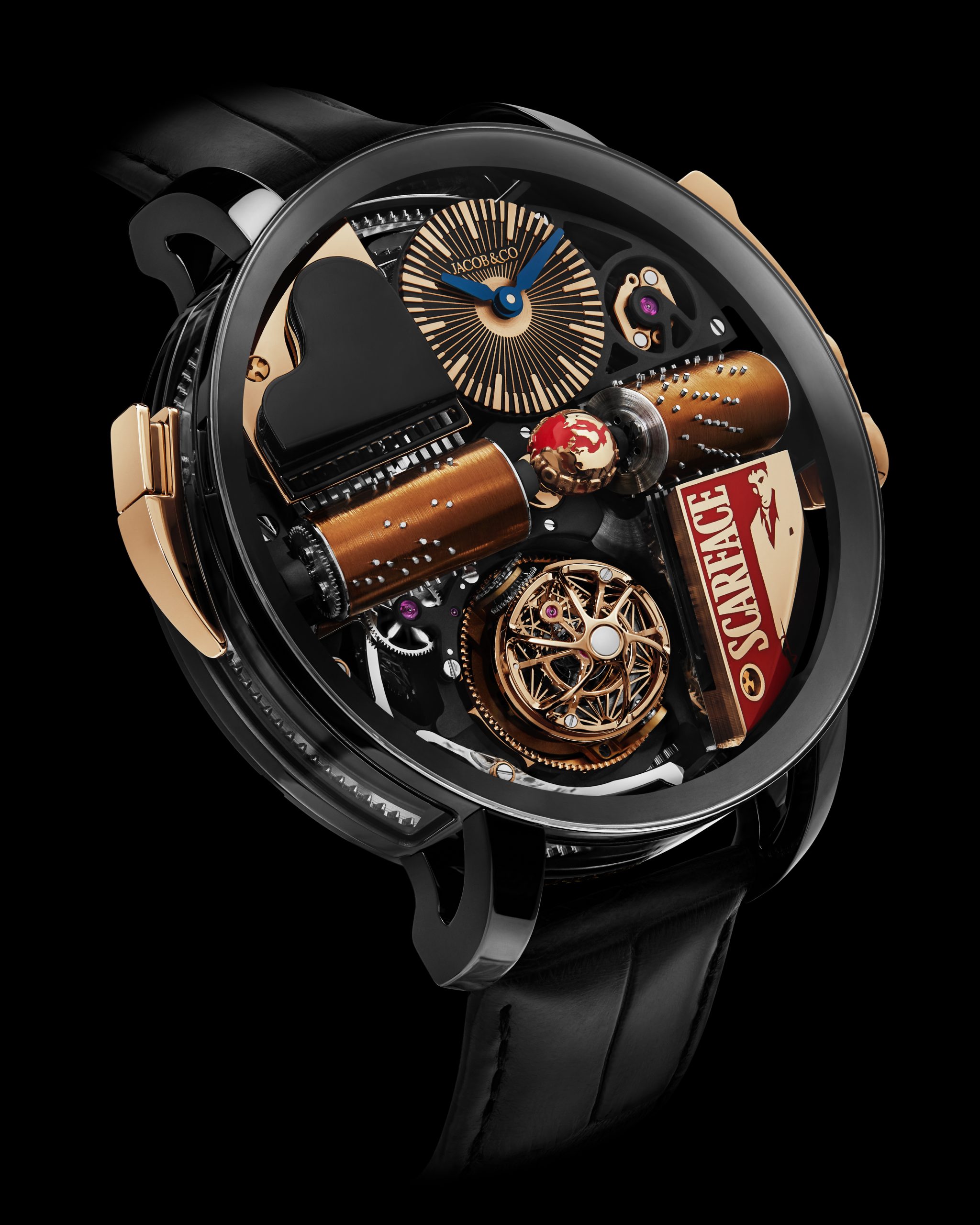 To honor this seminal movie, Jacob & Co. has expanded the Opera collection to include the Opera Scarface, playing “Bolivia” from the movie on the integrated music box. Jacob & Co. worked with Universal Brand Development to create this unforgettable timepiece.