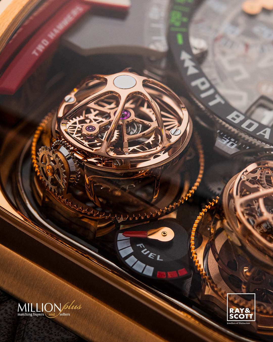 The Twin Turbo and Twin Turbo Furious combine the exhilarating energy experienced in the world’s fastest automobiles with the unparalleled refinement and mechanical complexity only present in the universe of haute horlogerie. Powering the Twin Turbo Furious’ main time display and monopusher chronograph functionalities are its twin triple-axis tourbillons: the most complicated, technically most challenging and visually most enthralling in the history of tourbillons. Encased in their delicately finished and ultra-light-weight cages, spinning through space in a succession of lightning fast, yet calculated movements, the Twin Turbo Furious can depend on two regulating organs. Each of these triple-axis tourbillons are composed of a stunning total of 104 components – and yet weighing a truly featherweight 1.15 grams.