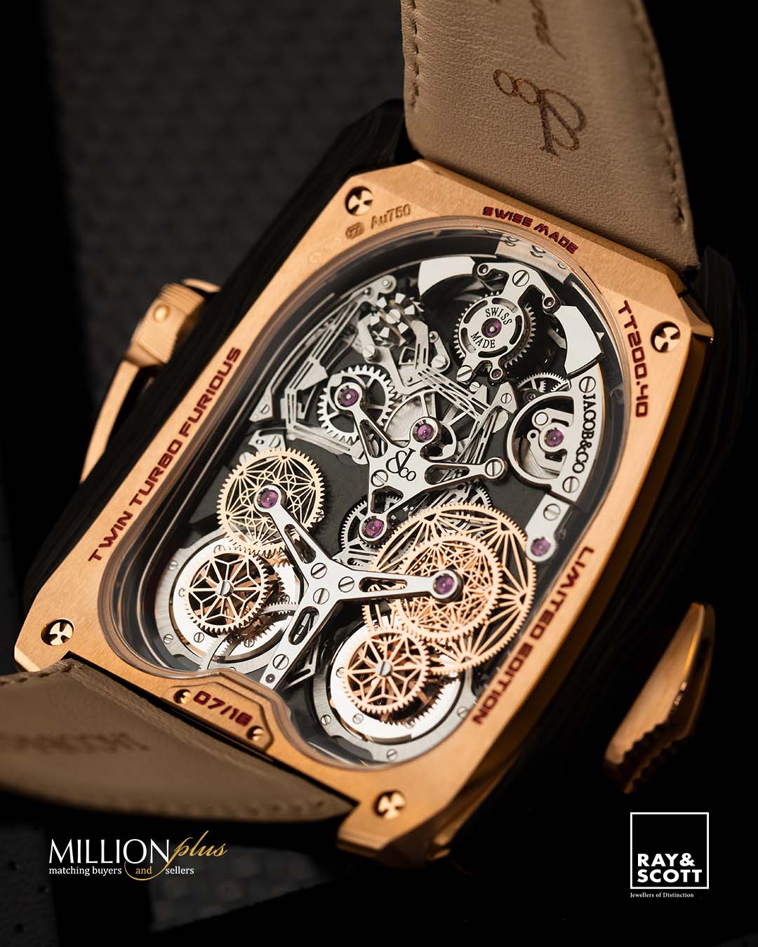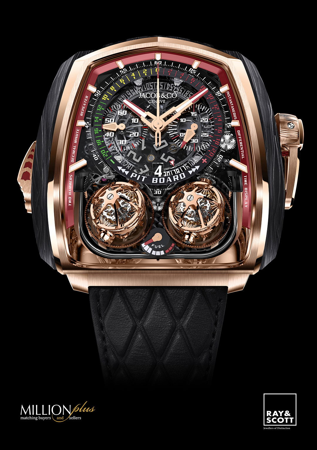 Part of the Twin Turbo’s 832-component JCFM05 Manufacture Jacob & Co caliber is a decimal minute repeater – the most exotic and rarest of all chiming complications. Push the slide set into the left-hand side of the Twin Turbo Furious’ highly engineered case – crafted from 18K rose gold and forged carbon – to hear the crystal-clear sound of its cathedral gongs.