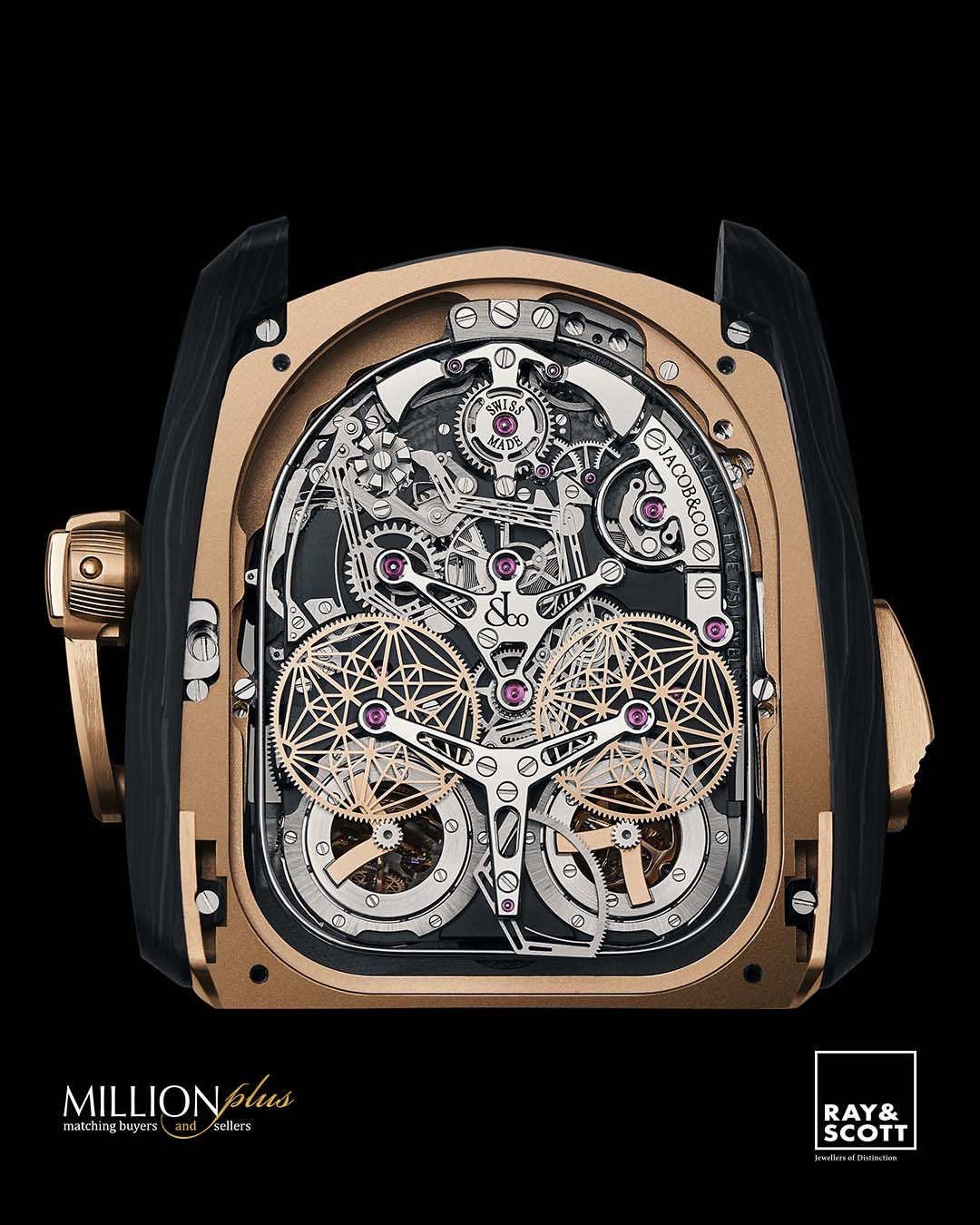 DIAL & HANDS: Smoked Sapphire with “Jacob&Co.” Logo, Red Neoralithe Inner Ring with Second Graduation; Red Neoralithe Indexes with White Superluminova Hands: Rose Gold;; White Superluminova.