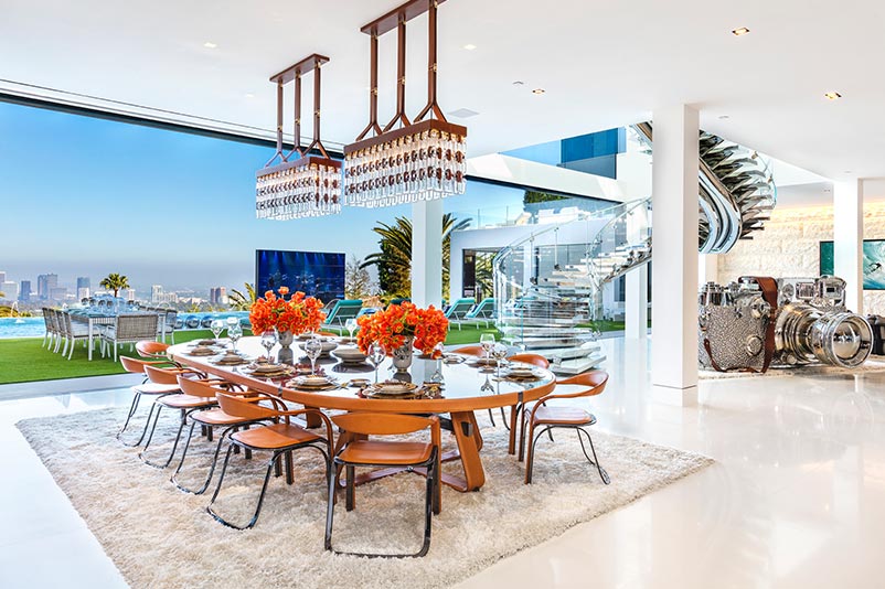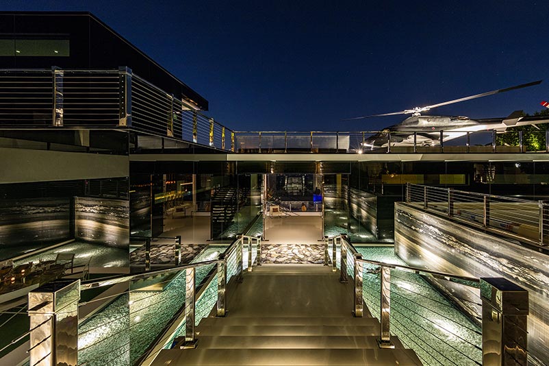 The Bel Air property boasts panoramic views, 12 bedrooms, 21 bathrooms, five bars, infinity pool and huge outdoor screen, indoor James Bond-themed cinema, bowling alley, 130 pieces of art and fleet of luxury cars and motorbikes. Also included, on the rooftop helipad, is the helicopter from the 1980s television show Airwolf.